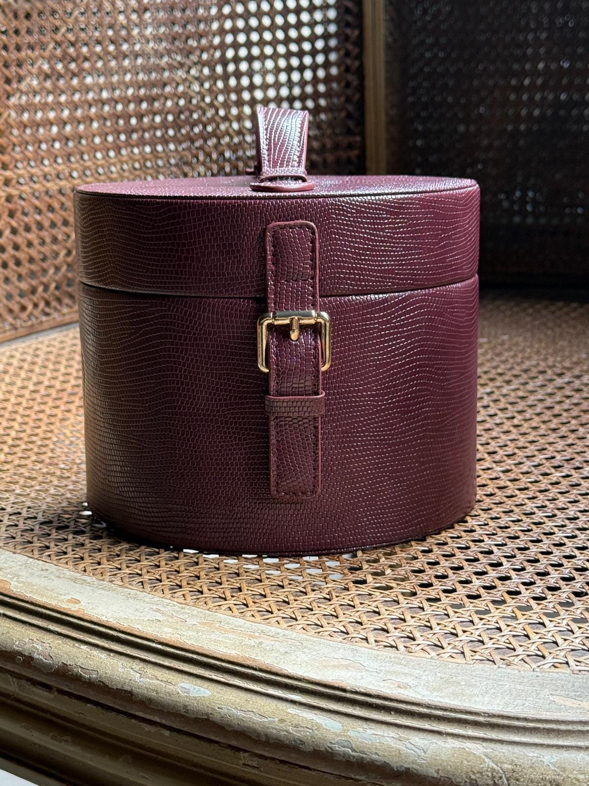 Dans l’atelier, une silhouette familière renaît : notre boîte signature, est réinterprété en version « mini mini ». Drapée dans un écrin de cuir végétal carmin, et ourlée d’un velours discret, elle s’avance comme un clin d’œil aux vanity case des années 50 — ces compagnons de voyage qui savaient tenir, dans leur secret intérieur, les parures et les parfums d’un autre monde.