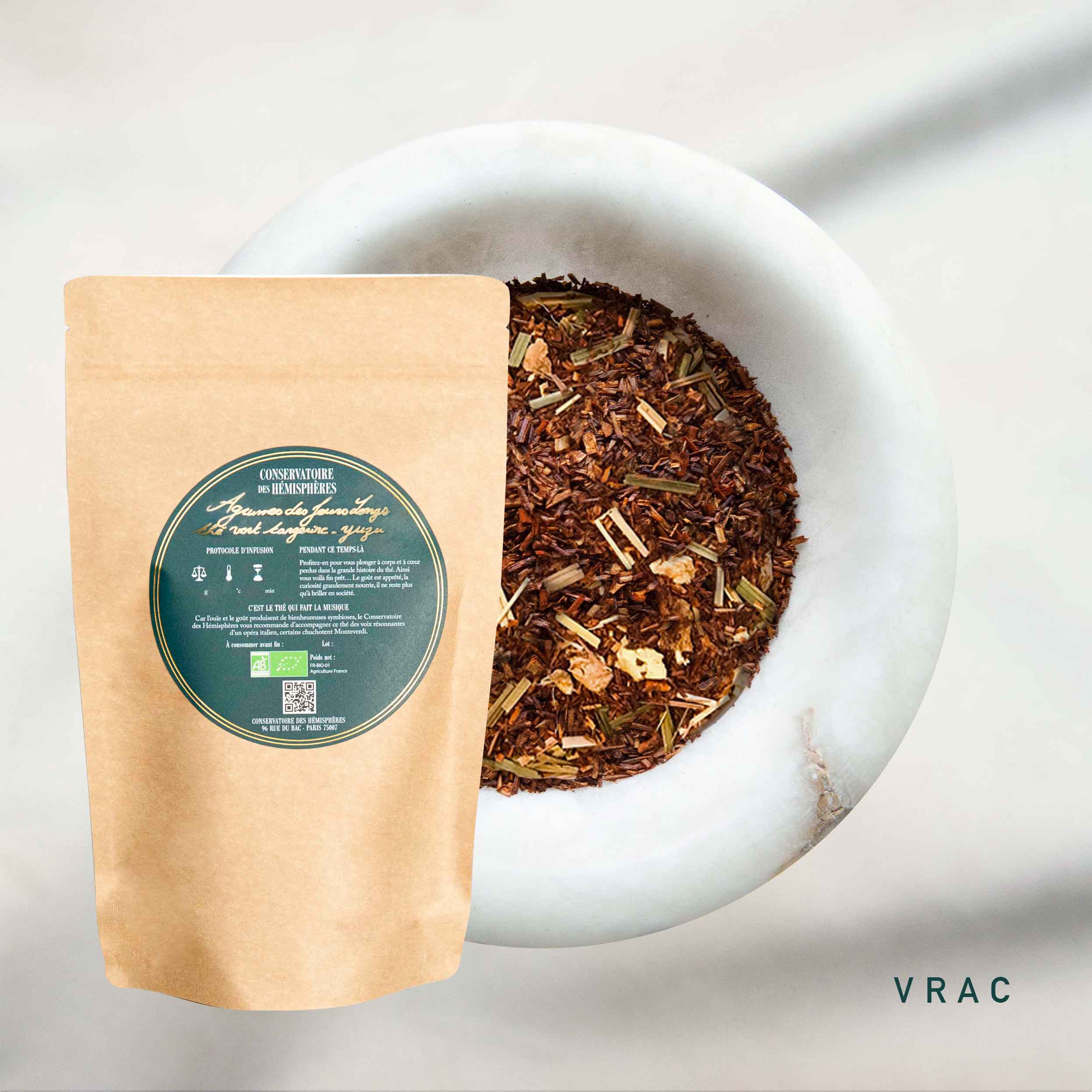 L’amertume singulière, mais addictive du fruit aux teintes dorées se manifeste par un subtil mélange de gingembre et de ses zestes nobles. Sans gravité, mais avec suavité, la citronnelle irradie les écorces de ce rooibos biologique qui offre un terrain d’expression agrumaire subjuguant.