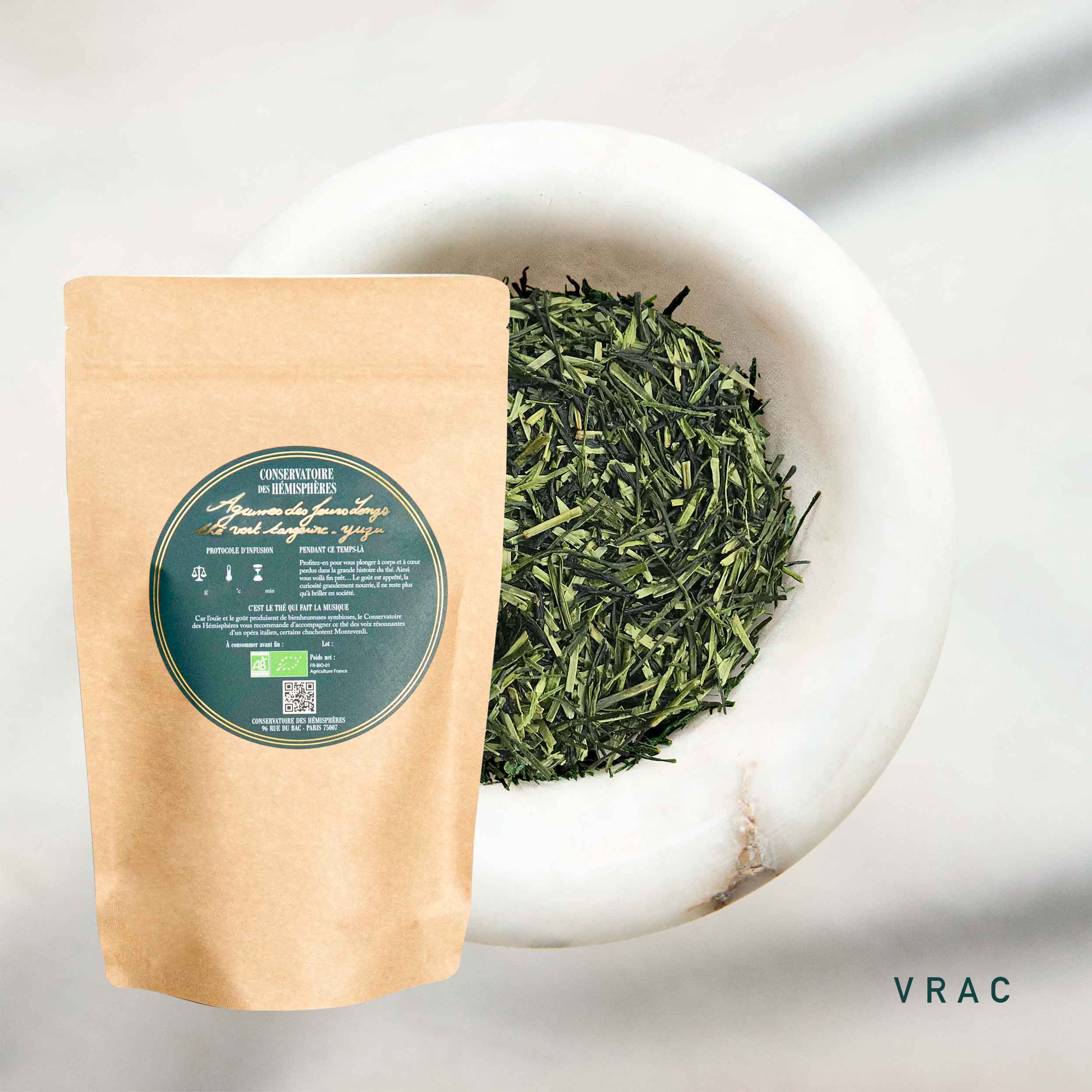 Le Kukicha est est un thé vert japonais, constitué de tiges et non des feuilles de l’arbre, provenant de la production du thé vert Sencha et de Gyokuro. Ce thé à tiges a des notes iodées, une douceur végétale et de fruits exotiques. Il contient peu de théine et donne une liqueur verte-dorée aux arômes doux.